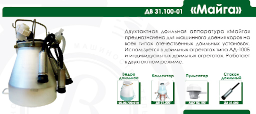 Двухтакная доильная аппаратура предназначена для машинного доения коров на всех типах доильных установок. Используется в доильных агрегатах типа АД-01, АД-02, АД-03, индивидуальных доильных агрегатах. Работает в двухтактном режиме.