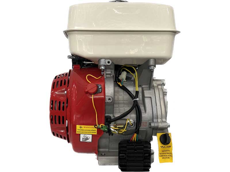 Бензиновый двигатель модели Stark GX390 7А воздушного охлаждения, OHV, мощностью 13,0 л.с., гильзованный, с большим моторесурсом. Изготовлен на одном из ведущих заводов PRC. Данный двигатель много лет используется на мотоблоках МТЗ, МоторСич, минитракторах МТЗ и других моделях сельскохозяйственной и строительной техники. В данном двигателе установлена система аварийного отключения двигателя при низком уровне масла и катушка освещения 18Ампер, которая позволяет подключать осветительные приборы и прочие потребители мощностью до 216 Вт. Выходной вал цилиндрический, диаметром 25мм, под призматическую шпонку.