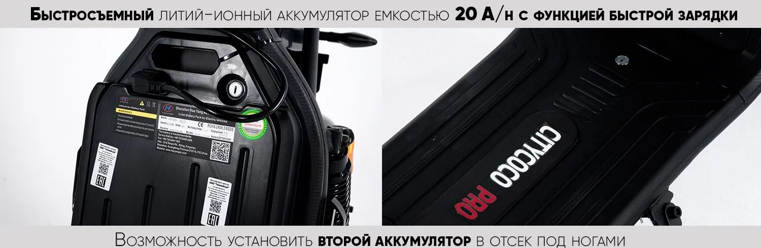 Электроскутер оснащен быстросъемным аккумулятором емкостью 20A/h. Также имеется возможность установить дополнительный аккумулятор.