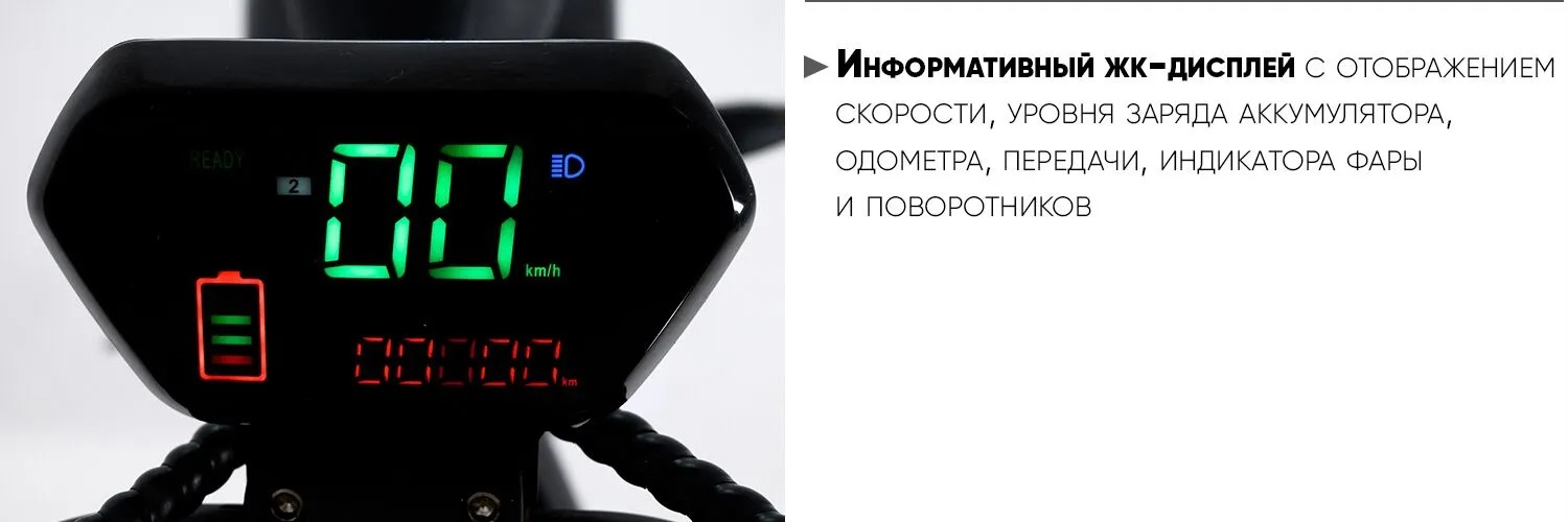 Информативный жк-дисплей с отображением скорости, уровня заряда аккумулятора, одометра, передачи, индикатора фары и поворотников.