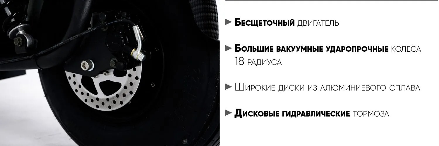 В движение электроскутер приводит мощный бесщеточный двигатель, который радует стабильной работой и мгновенным ускорением.