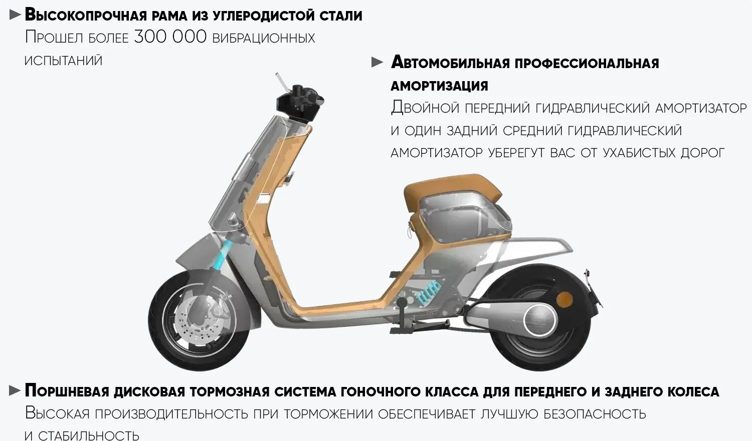 - Аккумулятор емкостью 48V30Ah обеспечивает надежную и длительную работу электроскутера.