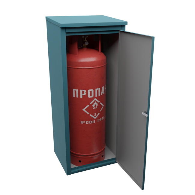 Шкаф для хранения газового баллона с габаритными размерами 106х42х34,5 см рассчитан на хранение стандартного баллона с пропаном объемом 50 л в полном соответствии с требованиями пожарной безопасности и правилами использования газа в быту. Изделие изготовлено из стойкой к коррозии оцинкованной стали и окрашено эмалью, что позволяет размещение во влажных помещениях.