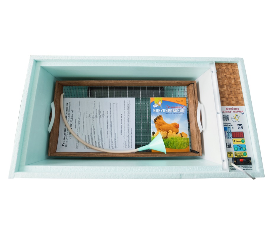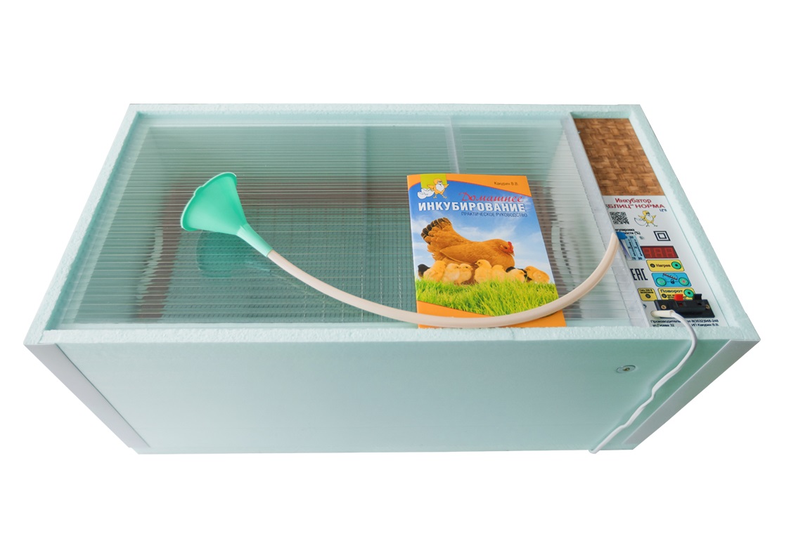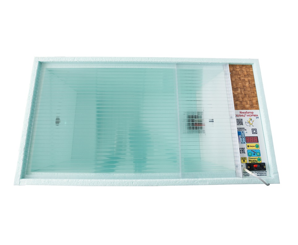 Инкубатор Блиц- Норма 72 представляет собой короб прямоугольной формы с размещенной на боковой стенке панелью управления. Корпус выполнен из пенополистирола, который обеспечивает необходимый уровень теплоизоляции. Сверху конструкция закрывается прозрачной крышкой, а внутри расположен лоток для яиц и две пластиковые ёмкости для воды.