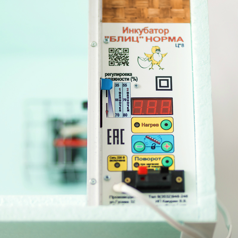 Переворот яиц – автоматический, с интервалом каждые 2 часа. При необходимости, инкубатор можно переключить на ручной режим. В выводной камере предусмотрен искусственный воздухообмен с помощью вентилятора.
