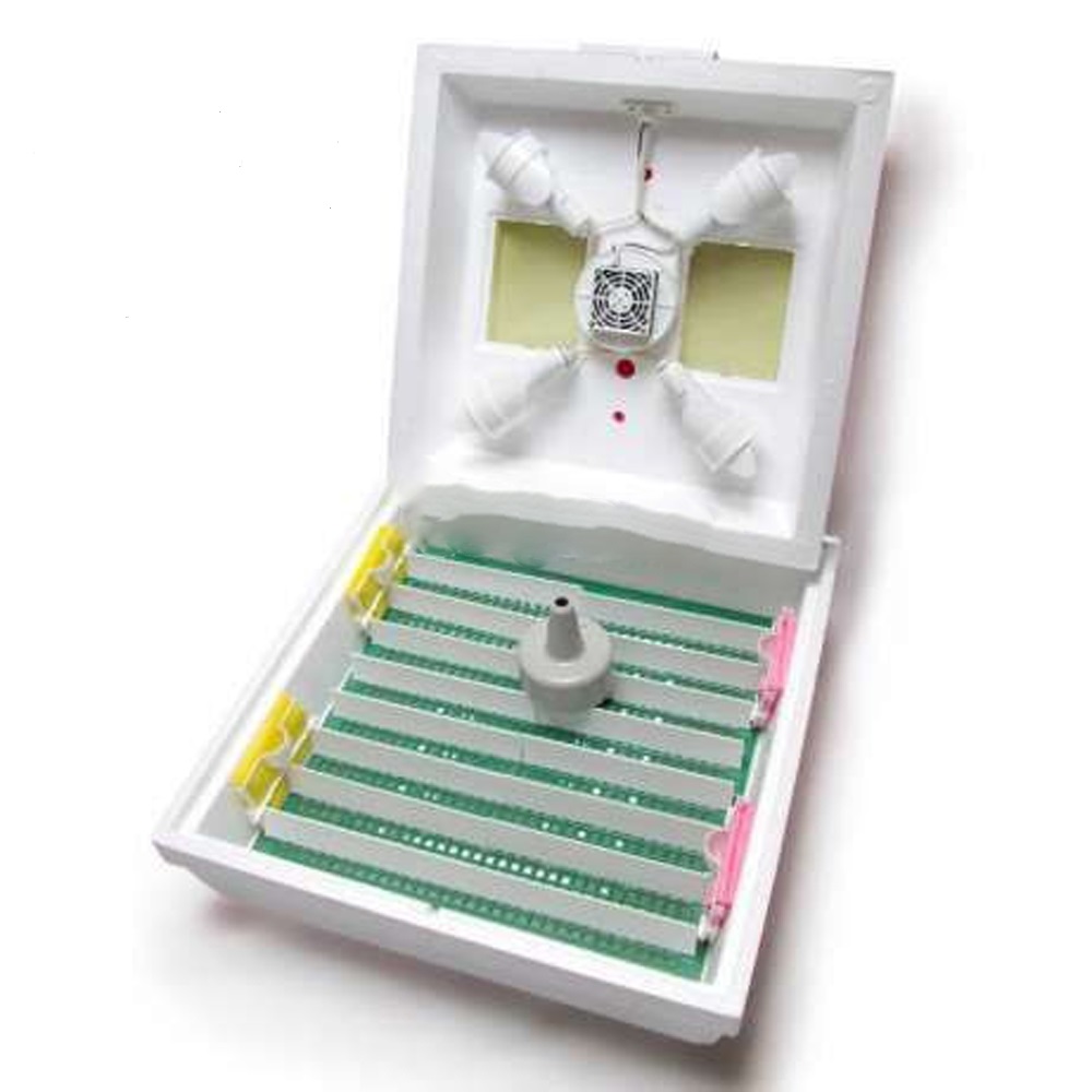 Внизу устройства имеются два водяных резервуара. Они, а также 8 вентиляционных отверстий обеспечивают вентиляцию и необходимую влажность воздуха. В крышке прибора находятся 2 обзорных окошка, предназначенных для визуального контроля за процессом инкубации. Внутри крышки расположен тэн, вентилятор и терморегулятор.