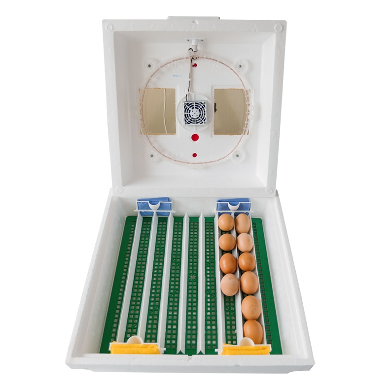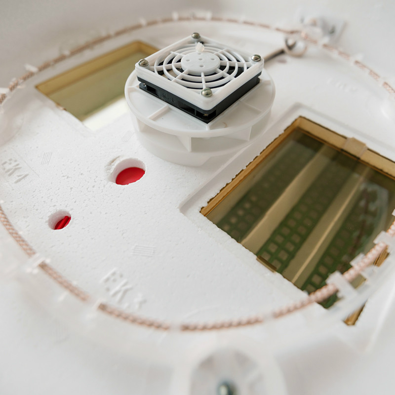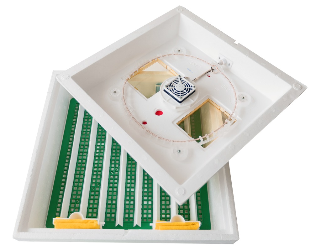 Внизу устройства имеются два водяных резервуара. Они, а также 8 вентиляционных отверстий обеспечивают вентиляцию и необходимую влажность воздуха. В крышке прибора находятся 2 обзорных окошка, предназначенных для визуального контроля за процессом инкубации. Внутри крышки расположен тэн, вентилятор и терморегулятор.