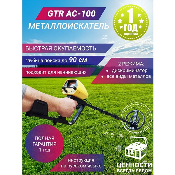 Металлоискатель GTR AC 100 является самым популярным ,надежным и простым в использовании среди бюджетных металлоискателей. В GTR AC 100 чувствительная и мощная катушка, также очень удобный подлокотник c фиксирующим ремнем. Он подходит для поиска любых типов металла (золото, серебро, других цветных и черных металлов). Присутствует удобная регулировка штанги по высоте. Что позволяет настроить длину прибора под рост человека. Прибор очень легкий и удобный в использовании. Водонепроницаемая катушка позволяет производить поиск металлических предметов на дне ручьев и неглубоких луж воды, на пляже.