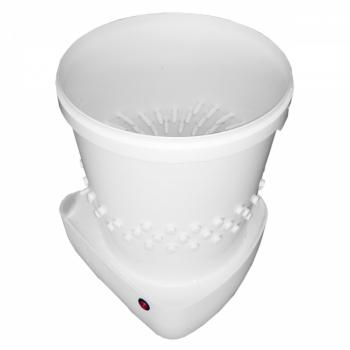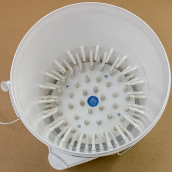 Корпус представленной перосъемной машины выполнен из прочного пластика и внешне похож на стиральную машину. По периметру корпуса установлены бильные пальцы. Общее количество билов 115 штук. Работает машина по принципу центрифуги. После закладки птицы электродвигатель провоцирует движение днища по кругу. В этот момент билы снимают оперение с тушек. Чтобы перья сразу удалялись, фермер поливает загруженный продукт водой.