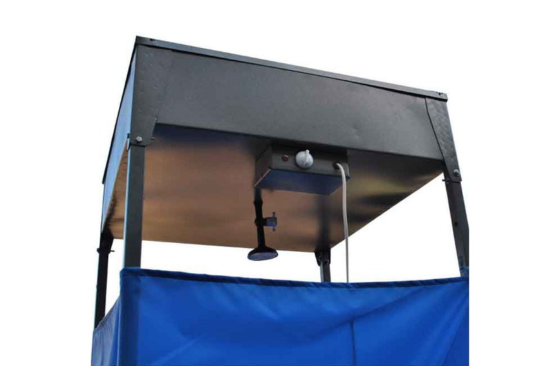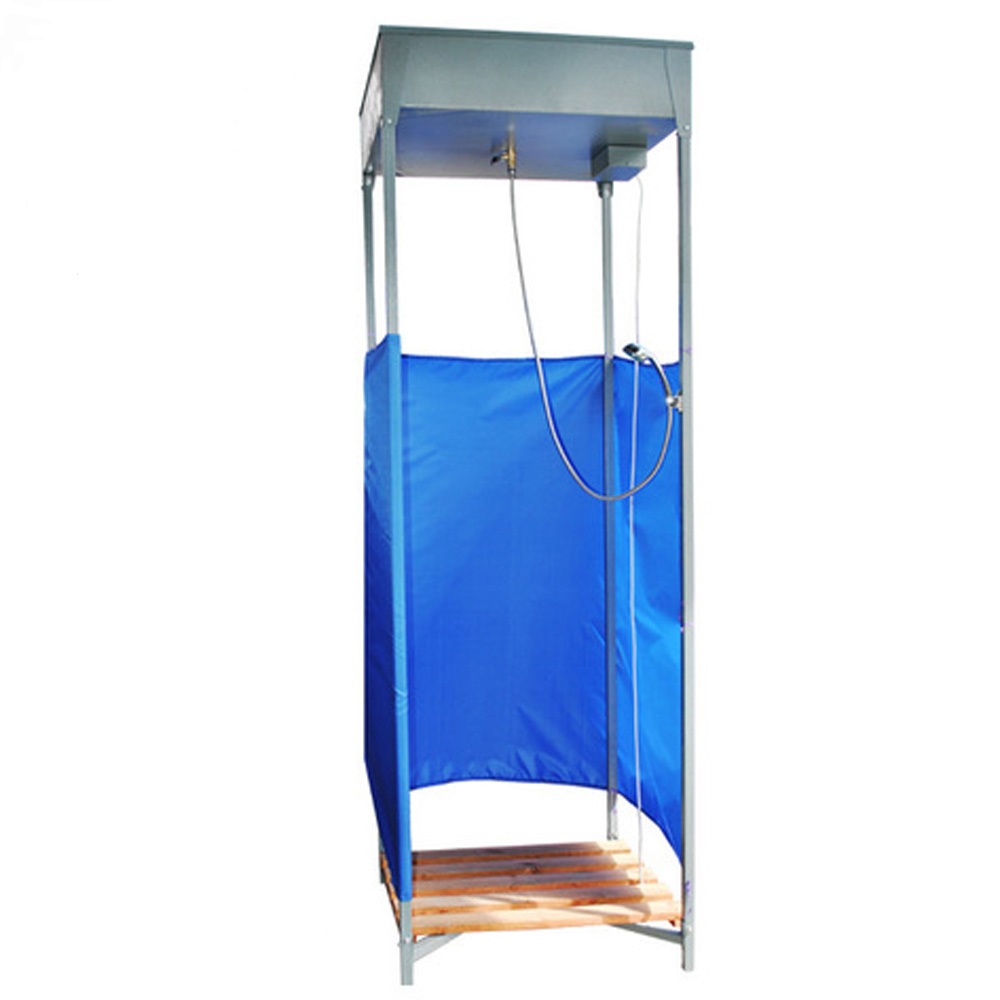 Разборный каркас кабины изготовлен из профильной трубы 30х30 мм. Каркас обтянут влагостойкой тканью-шторкой таким образом, чтобы в верхней и нижней части кабины обеспечивалась естественная вентиляция. Душевая кабина оснащена 128-литровым баком для воды. Бак изготовлен из высококачественной стали. Внутри бак обработан гальваническим цинковым покрытием. Данное покрытие, в первую очередь, исключает появление ржавчины и, самое главное, обеспечивает долговечность изделия. Такой бак легко прогревается под солнечными лучами. Кабина конструкции легко и быстро монтируется.