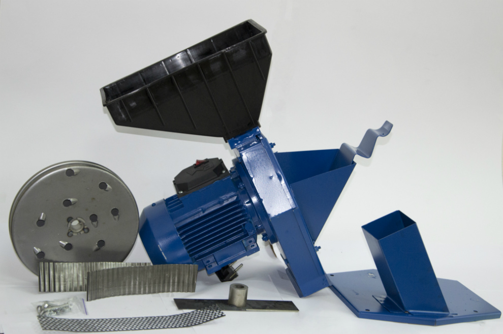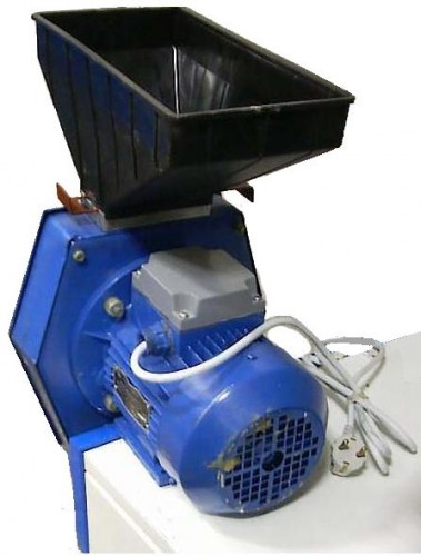 При работе с зерном устанавливаются ножи-молотки, а также сменные сетки с разным диаметром отверстий для регулировки помола. Подача перерабатываемого зерна в рабочую область устройства осуществляется из установленного в верхней части пластикового бункера. Скорость подачи регулируется заслонкой.