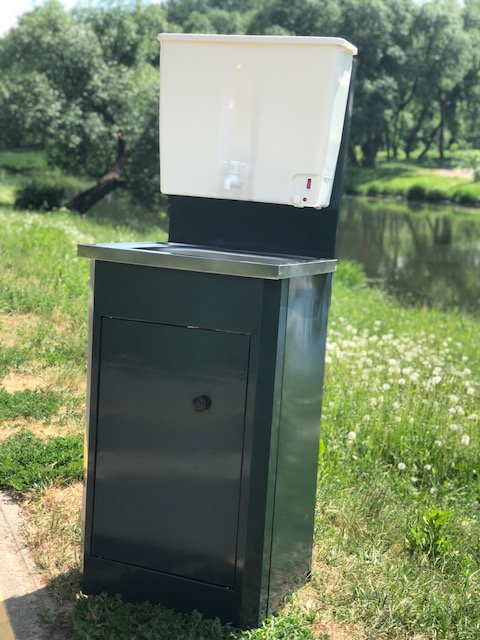Тумба умывальника для дачи размерами 43 х 50 х 130 сантиметров изготовлена из оцинкованной стали и окрашена порошковой краской.