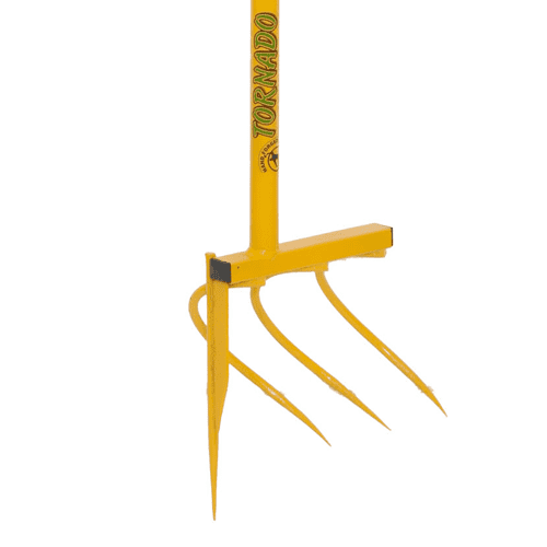 Принцип работы таков: инструмент ставим вертикально вниз на земельный участок параллельно гряде и поворачиваем вокруг оси — вворачиваем зубья инструмента в почву под картофельный куст, выкидывая клубни наружу.