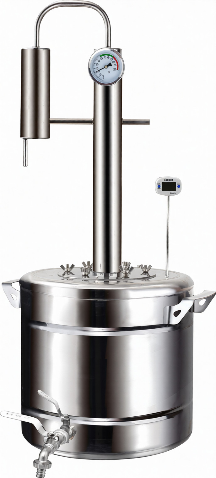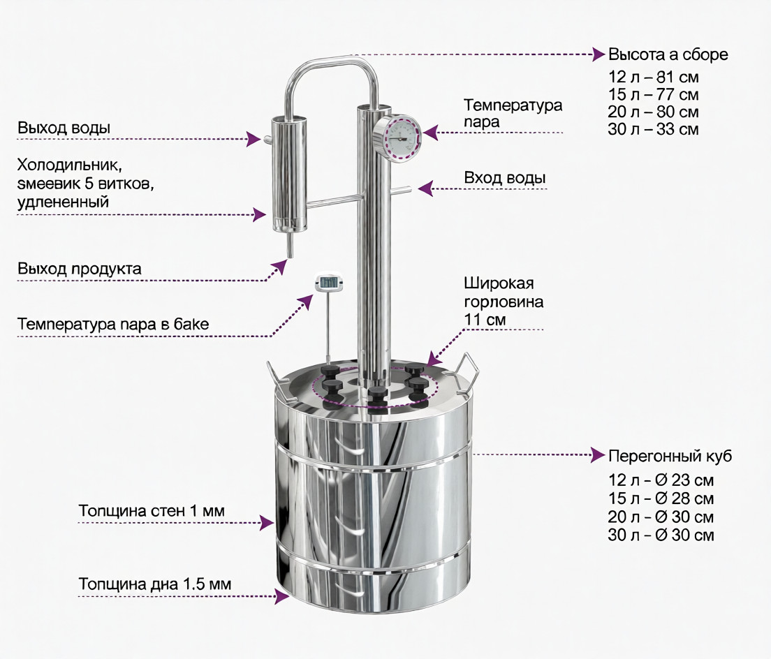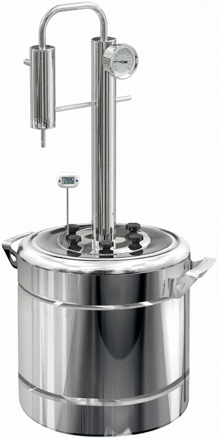 Самогонный аппарат имеет простую и надежную конструкцию. Широкая горловина поможет легко очистить перегонный куб. Качественные материалы — российская нержавеющая сталь и комплектующие, такие как термодатчик и прокладки из термостойкого пищевого силикона позволяют гарантировать длительный срок службы аппарата и его надежность.