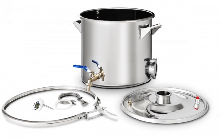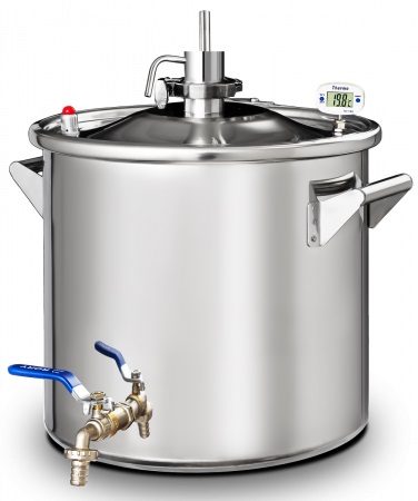 Перегонный куб можно использовать в качестве бродильной емкости. Сталь марок AISI 304 и 430 полностью инертна к кислой среде, не окисляется и не меняет вкус напитка. Для созревания браги нужно установить на бак заглушку с «носиком», а подключенный шланг погрузить в воду.