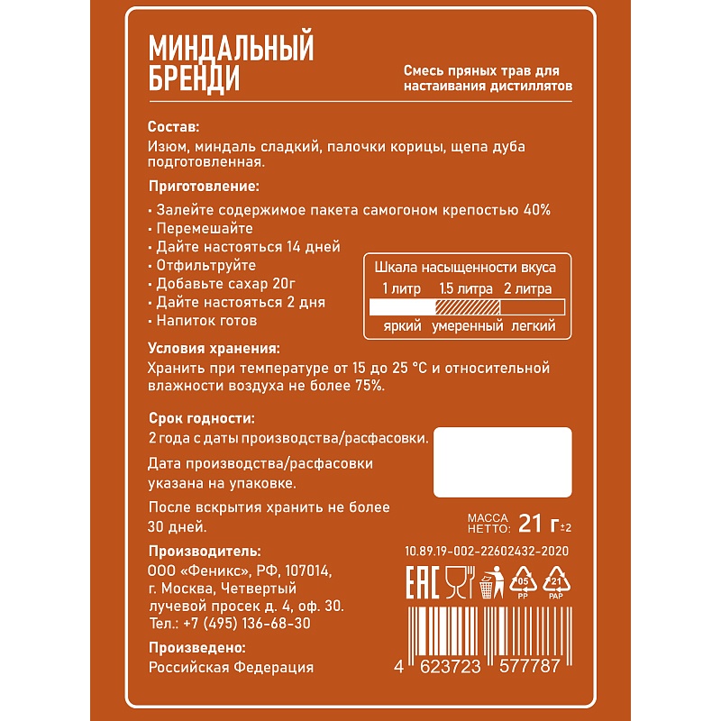 Набор «Миндальный бренди» - это яркий вкус миндаля, который дополняется пряностью корицы и изюмом. Дубовая щепа формирует фирменный аромат бренди.