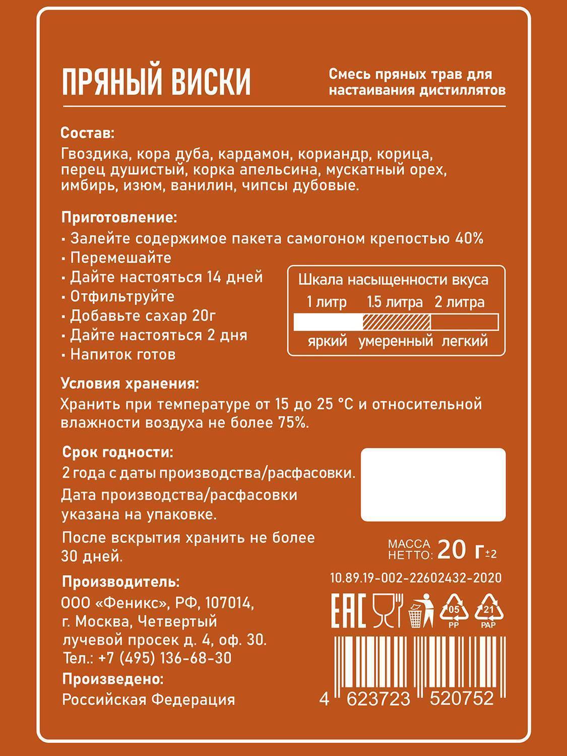 Набор «Пряный виски» - это уникальное сочетание пряностей, делающих ваш напиток легким на вкус с согревающим послевкусием. Каждый элемент, входящий в состав, выполняет отведенную ему роль. Корица и имбирь обладают тонизирующим свойством; гвоздика и кориандр – поднимут настроение после тяжелого дня; душистый перец придаст пикантности напитку, а корка апельсина и ванилин отвечают за нежность аромата.