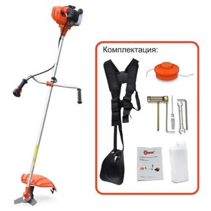Мощный бензиновый триммер (мотокоса), оснащенная высокооборотистым 2-хтактным мотором на два киловатта. Прямой жесткий вал передает с минимальными потерями крутящий момент на редуктор. Удобный ремень рюкзачного типа оптимально распределяет вес на спину и руки, позволяя косить продолжительное время без усталости.