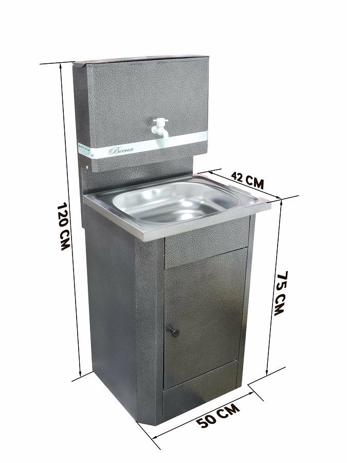Для удобства монтажа вывода слива воды, задняя стенка тумбы отсутствует, а большая дверца позволяет удобно вынимать отливную тару. Тумба-стойка поставляется в разобранном виде в коробке. Умывальник портативный, легкий, со сборкой справится даже ребенок. Уличный умывальник сделан из стали и обработан порошковой краской защищающее от коррозии, ржавчины для долгого срока службы. Размер мойки 400 х 500 мм.