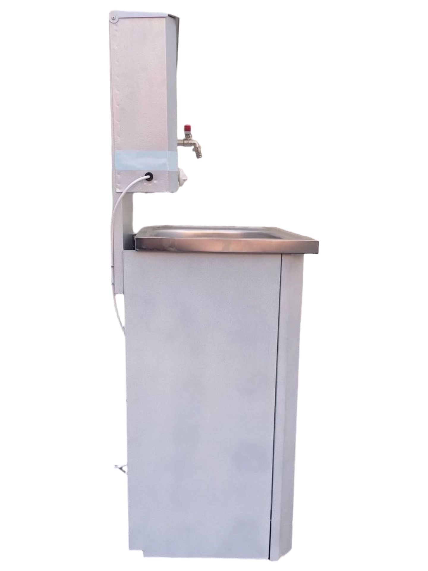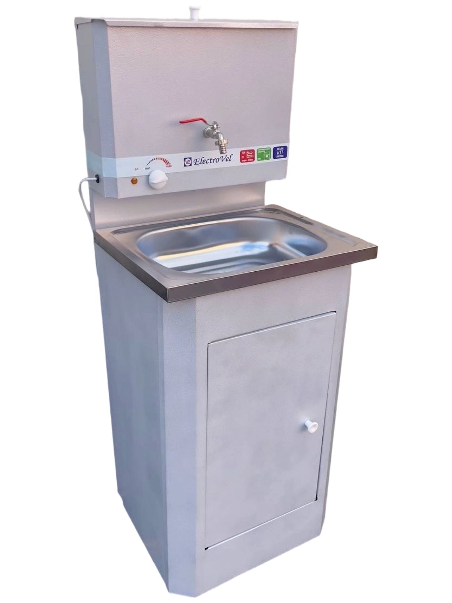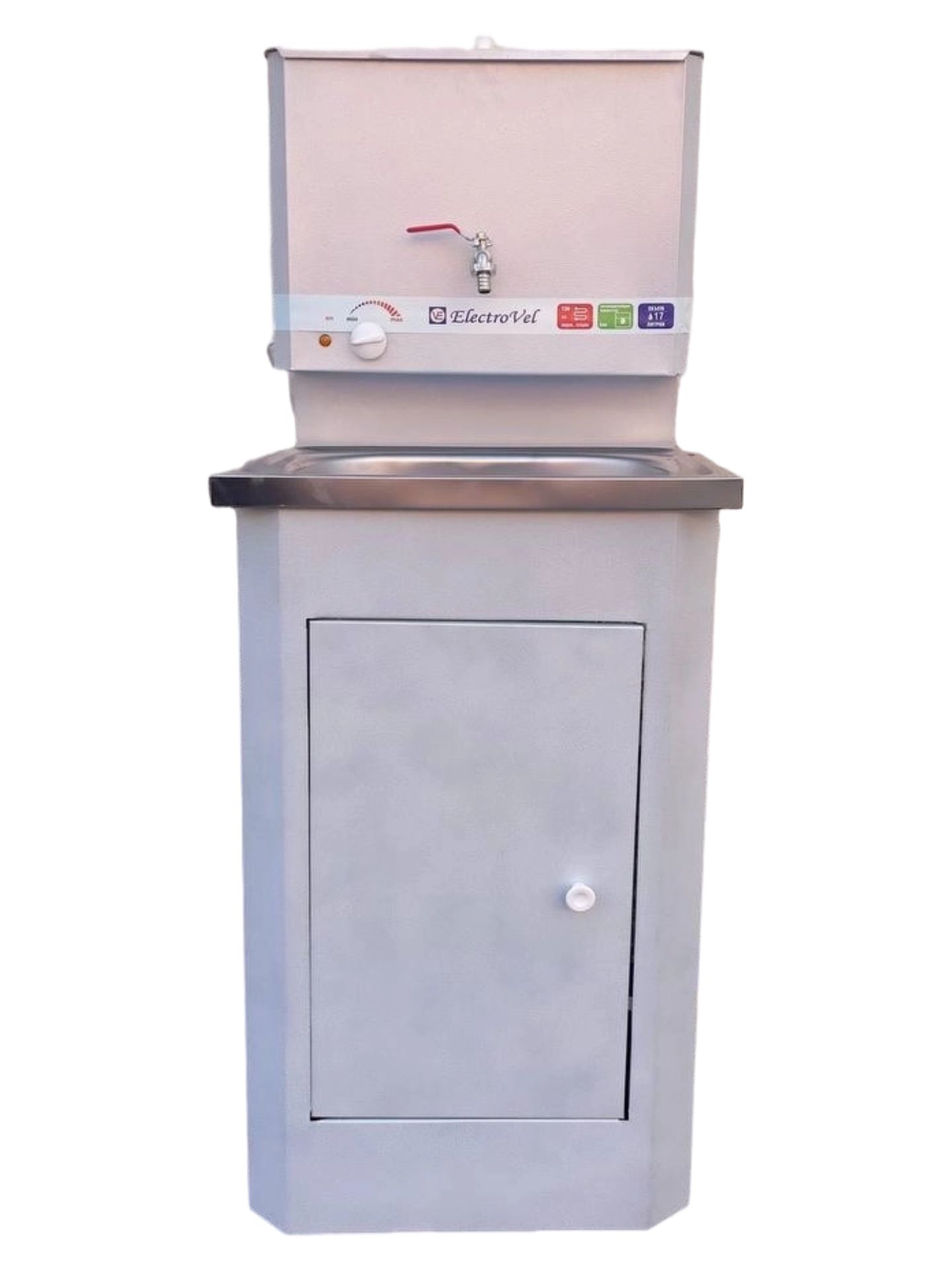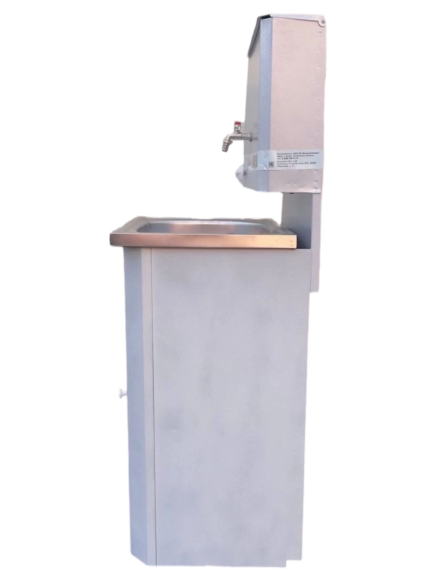 Конструкция умывальник сборная, состоит из тумбы, которая незаметно скрывает способ отлива воды и позволяет производить отвод воды даже в канализацию, и бака с металлическим шаровым краном, ТЭН.