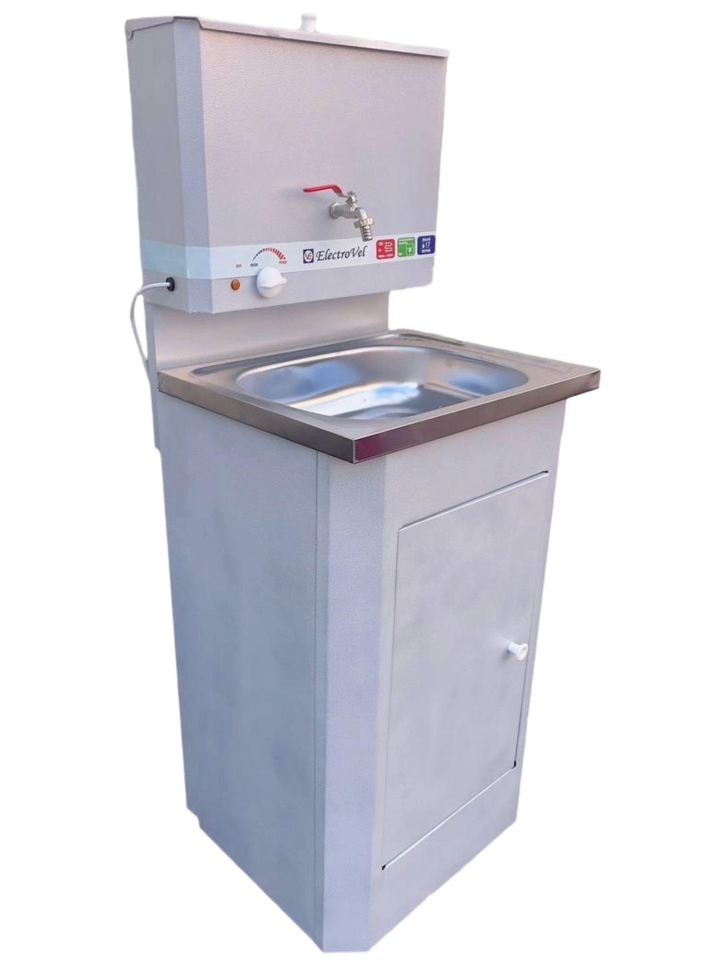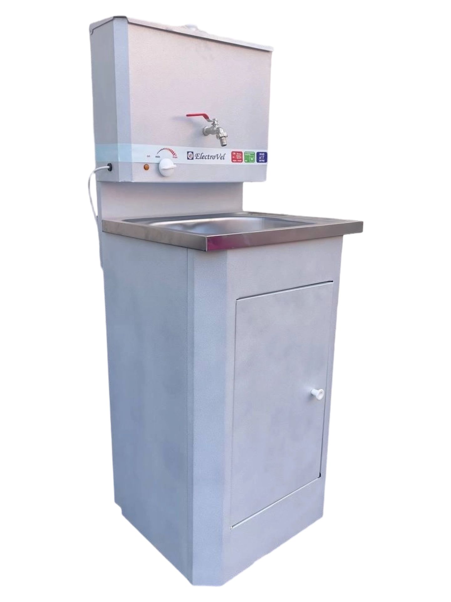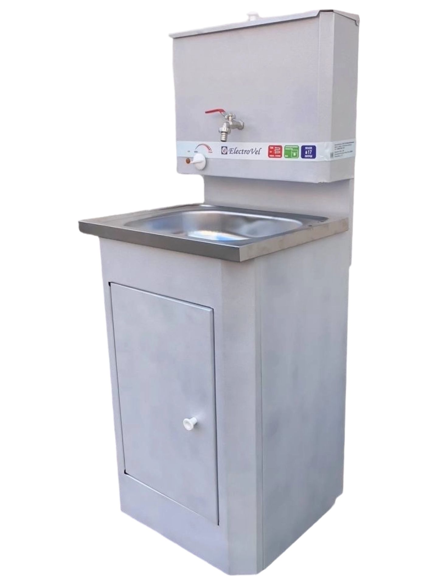 Конструкция умывальник сборная, состоит из тумбы, которая незаметно скрывает способ отлива воды и позволяет производить отвод воды даже в канализацию, и бака с металлическим шаровым краном, ТЭН.