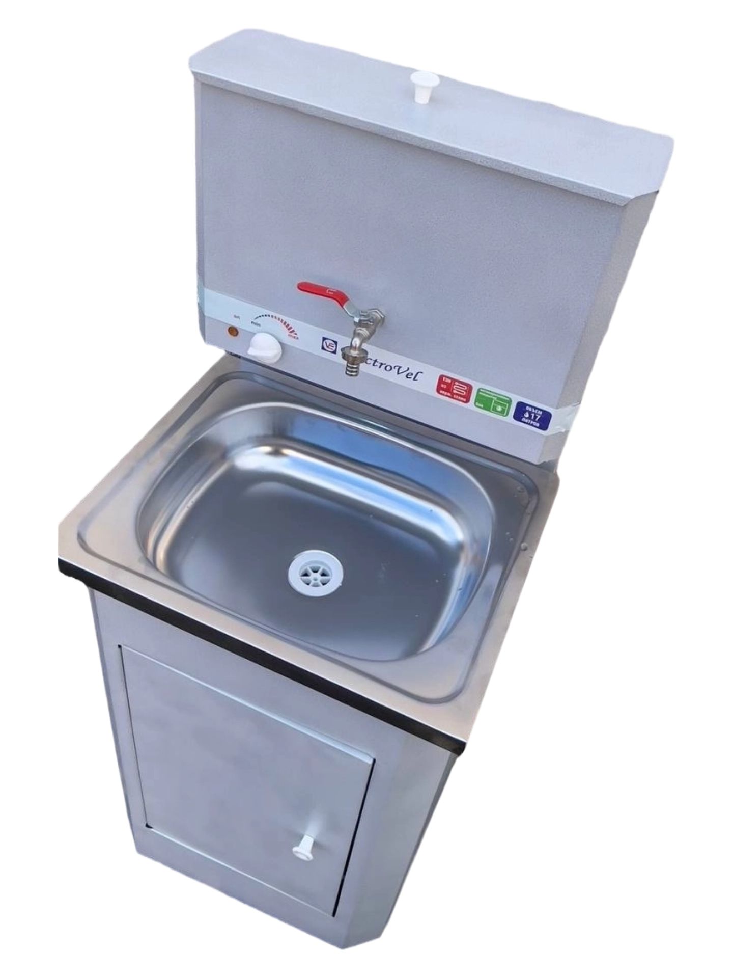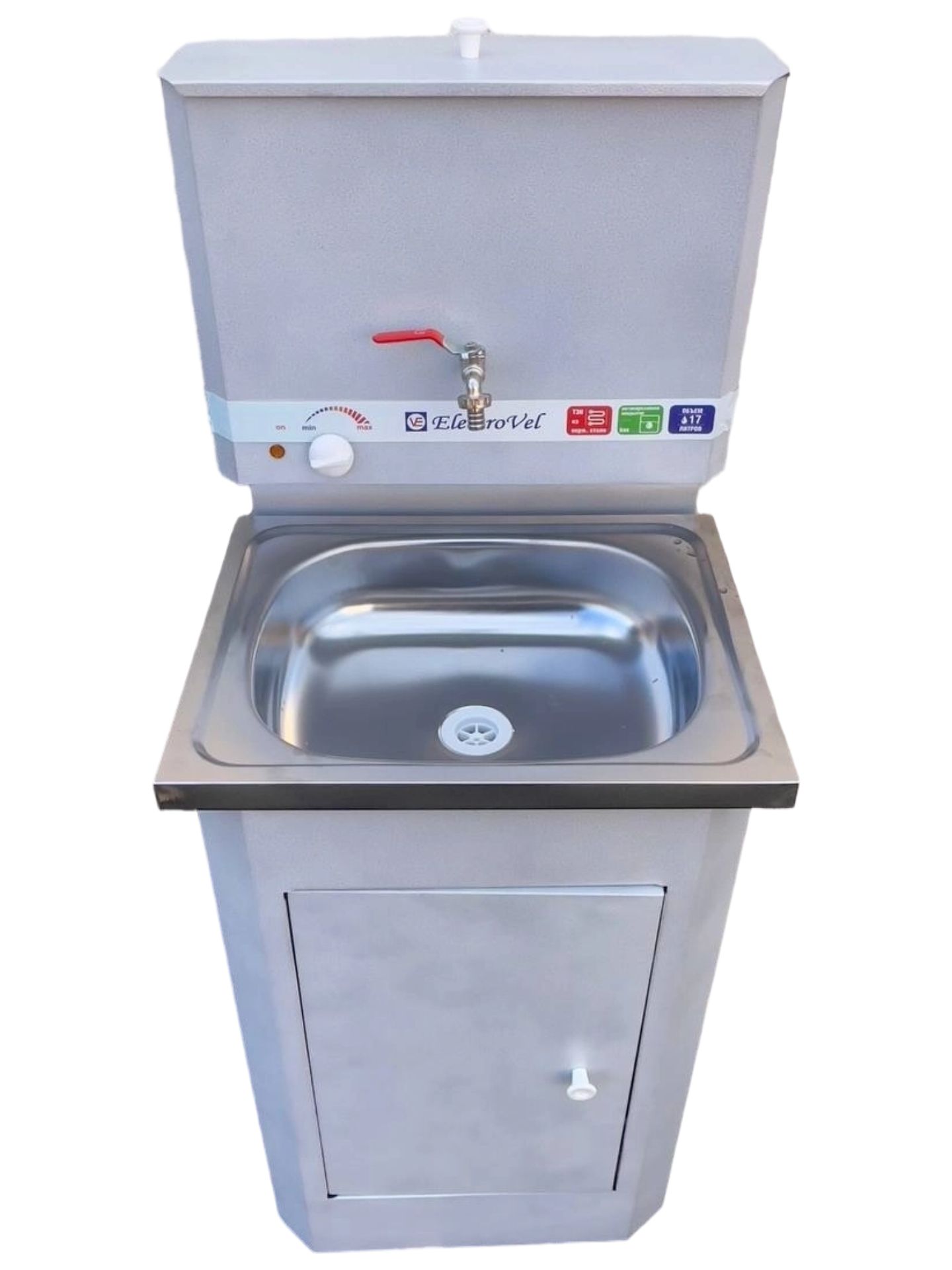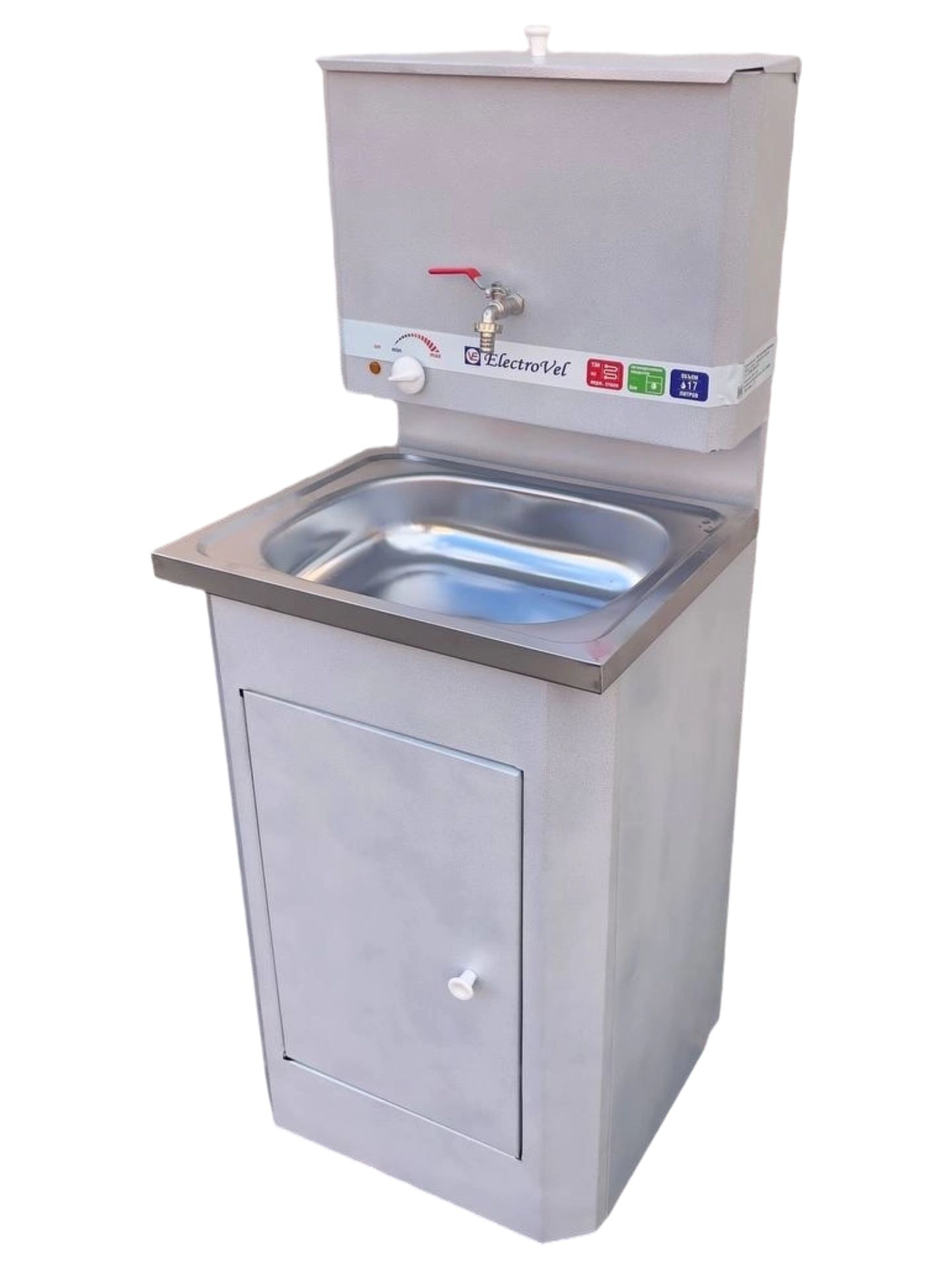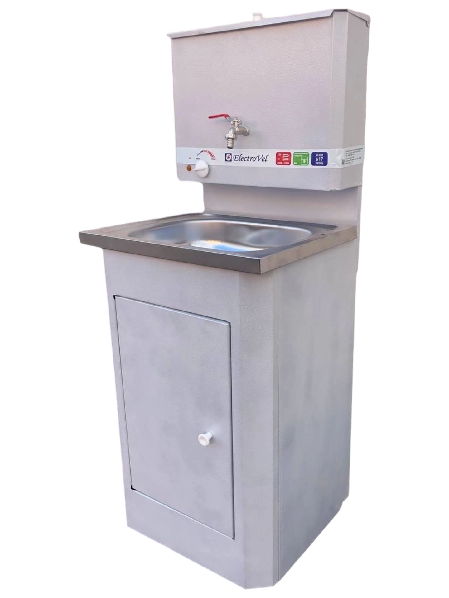 Конструкция умывальник сборная, состоит из тумбы, которая незаметно скрывает способ отлива воды и позволяет производить отвод воды даже в канализацию, и бака с металлическим шаровым краном, ТЭН.